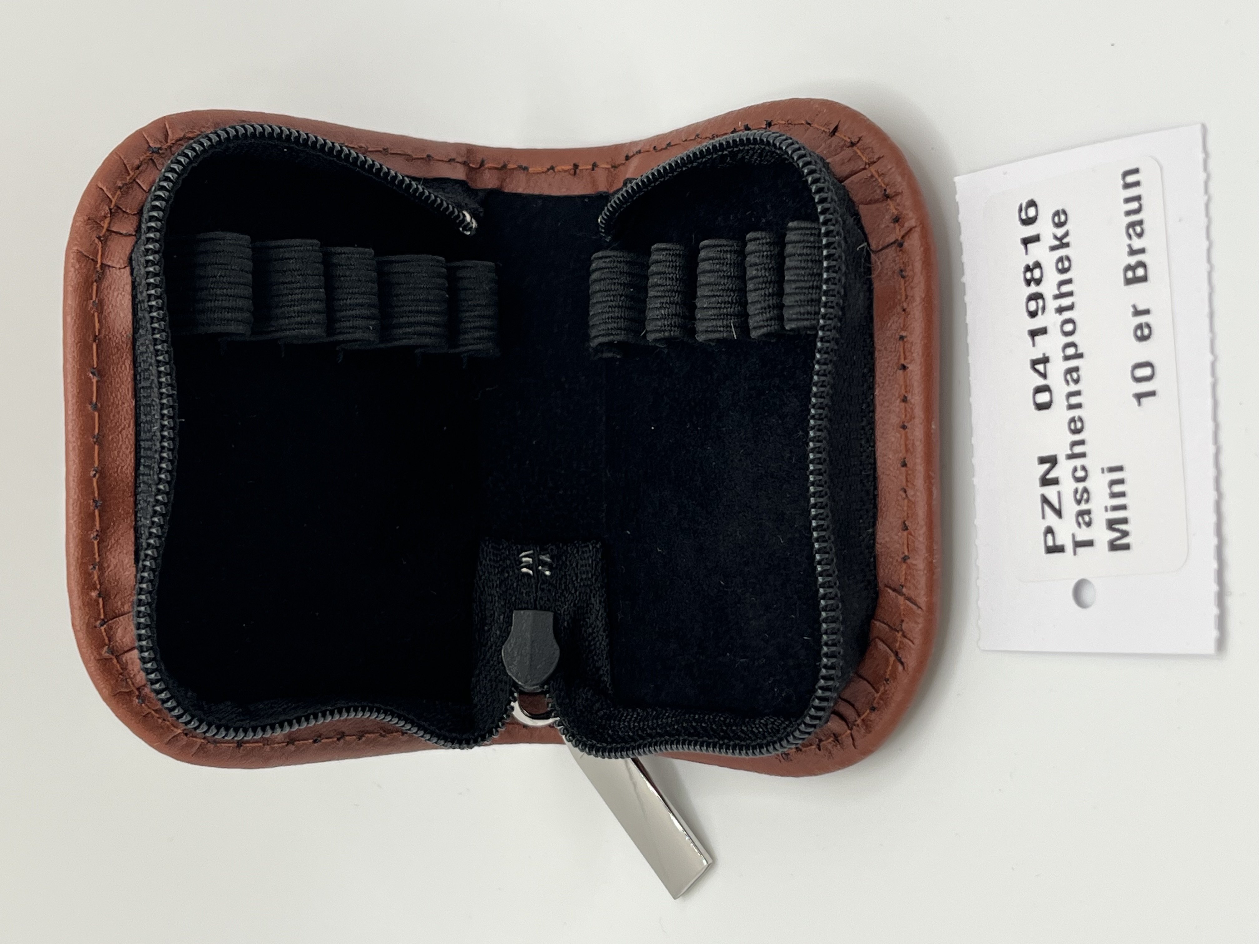Das weiche Velours Innenfutter sowie die farblich angepassten Schlaufen ermöglichen ein übersichtliches Einsortieren der Röhrchen und einen sicheren Schutz vor Stößen. Ein gutgängiger Reißverschluss mit edlem Metallzipper rundet die Optik dieser Taschenapotheke Mini ab.