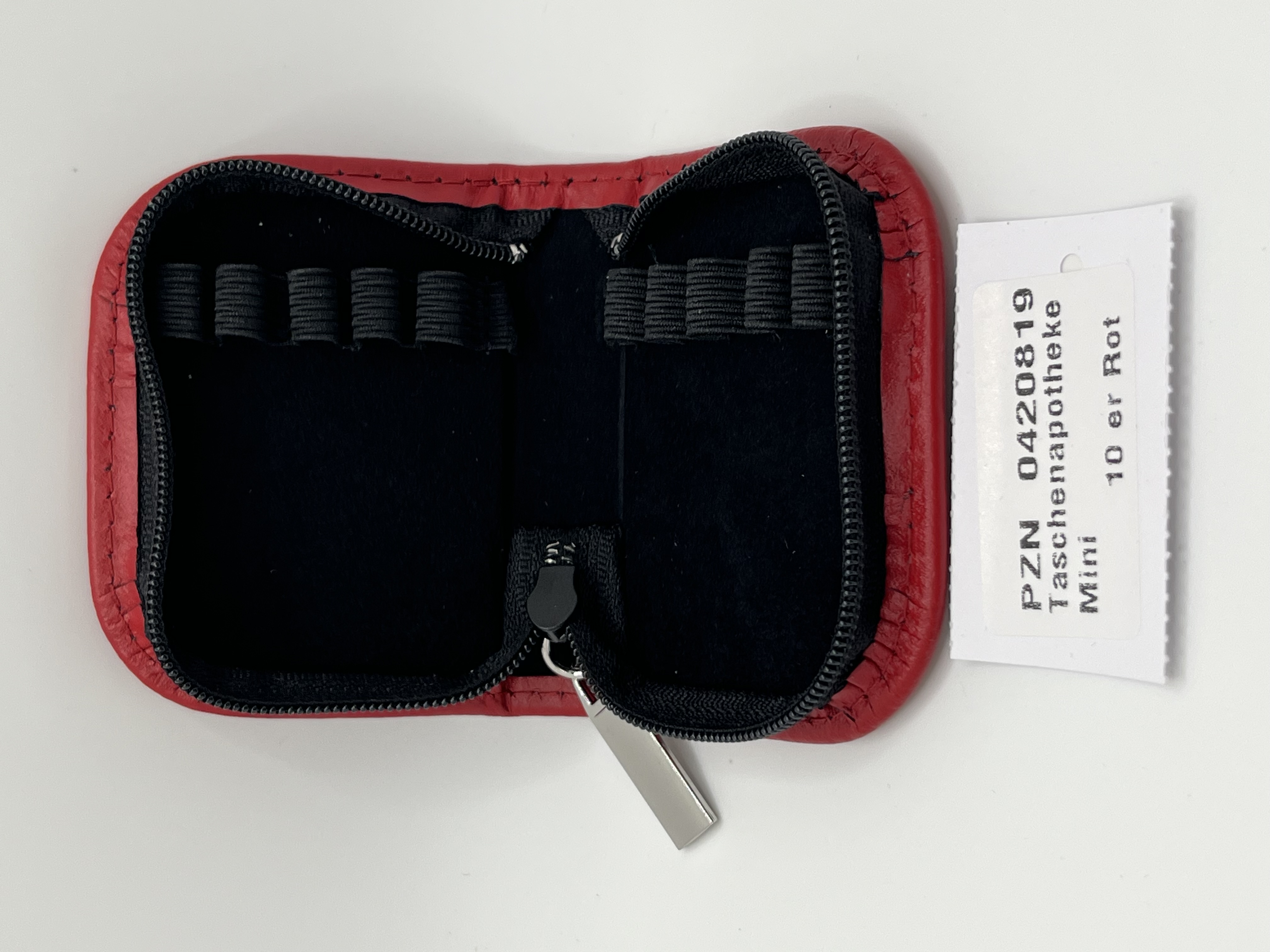 Das weiche Velours Innenfutter sowie die farblich angepassten Schlaufen ermöglichen ein übersichtliches Einsortieren der Röhrchen und einen sicheren Schutz vor Stößen. Ein gutgängiger Reißverschluss mit edlem Metallzipper rundet die Optik dieser Taschenapotheke Mini ab.