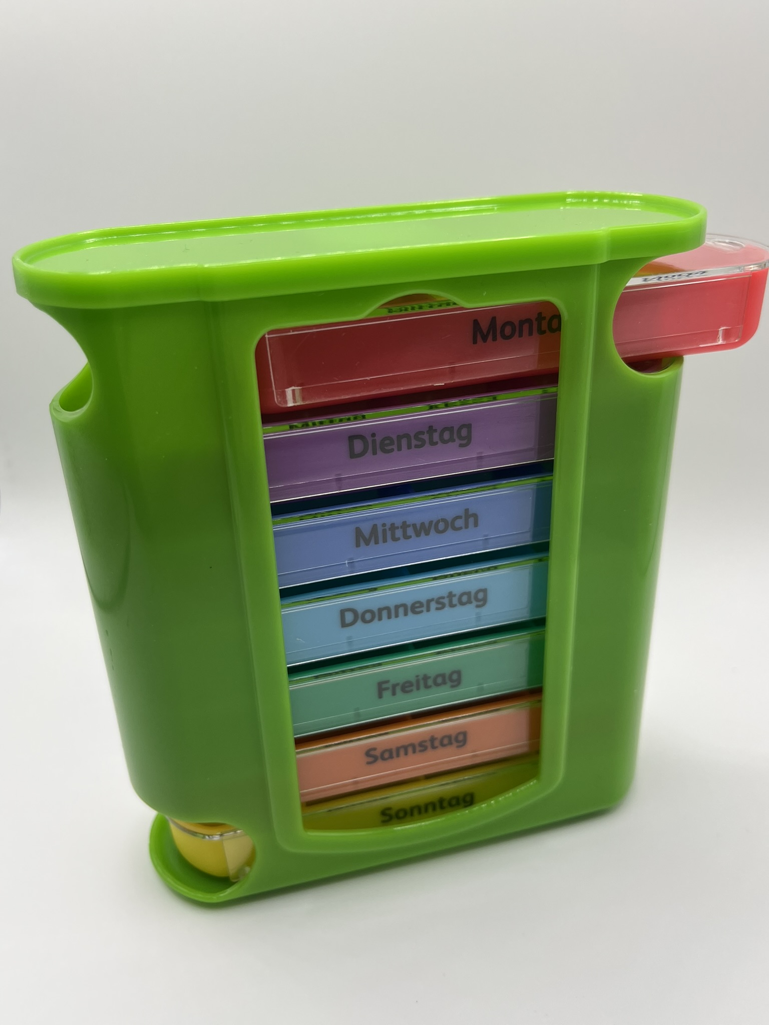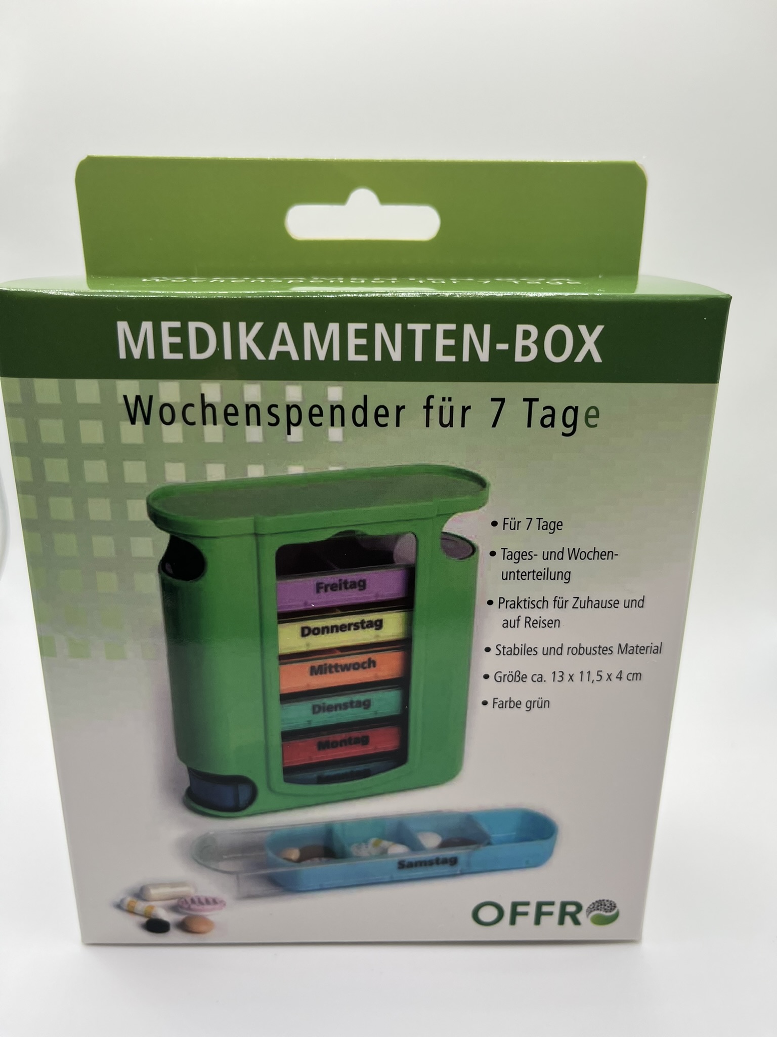 Mit dem 7-Tage Wochenspender und 4 Fächern pro Tag von Montag bis Sonntag behalten Sie die Übersicht und nehmen Ihre Medikamente immer regelmäßig ein. Die Befüllung der Box erfolgt einmal pro Woche. Perfekt für Senioren mit großer Beschriftung auf den verschiedenfarbigen Tages-Schubladen. Die Schiebedeckel des Medikamentendosierers lassen sich auch bei motorischen Problemen einfach aufziehen. Für unterwegs ein idealer Reisebegleiter, der Wochenspender ist kompakt und spart auf Reisen Platz. Jede Tablettendose sitzt rutschfest im Tablettenspender und kann unterwegs auch separat befördert werden!